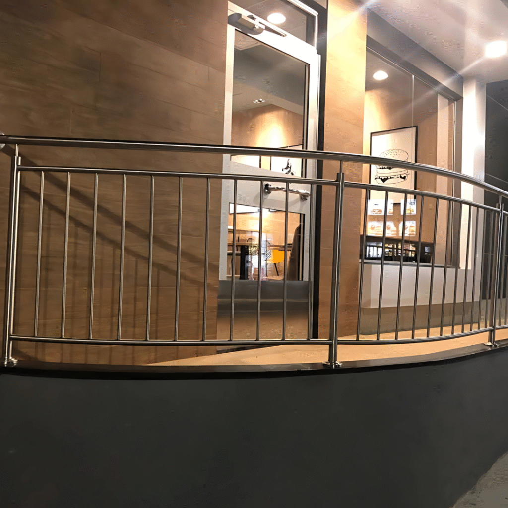 Pode ser fabricado em diferentes materiais, como aço inox escovado ou polido, aço carbono com pintura eletrostática e vidro temperado ou laminado, atendendo às exigências técnicas e estéticas de cada projeto.